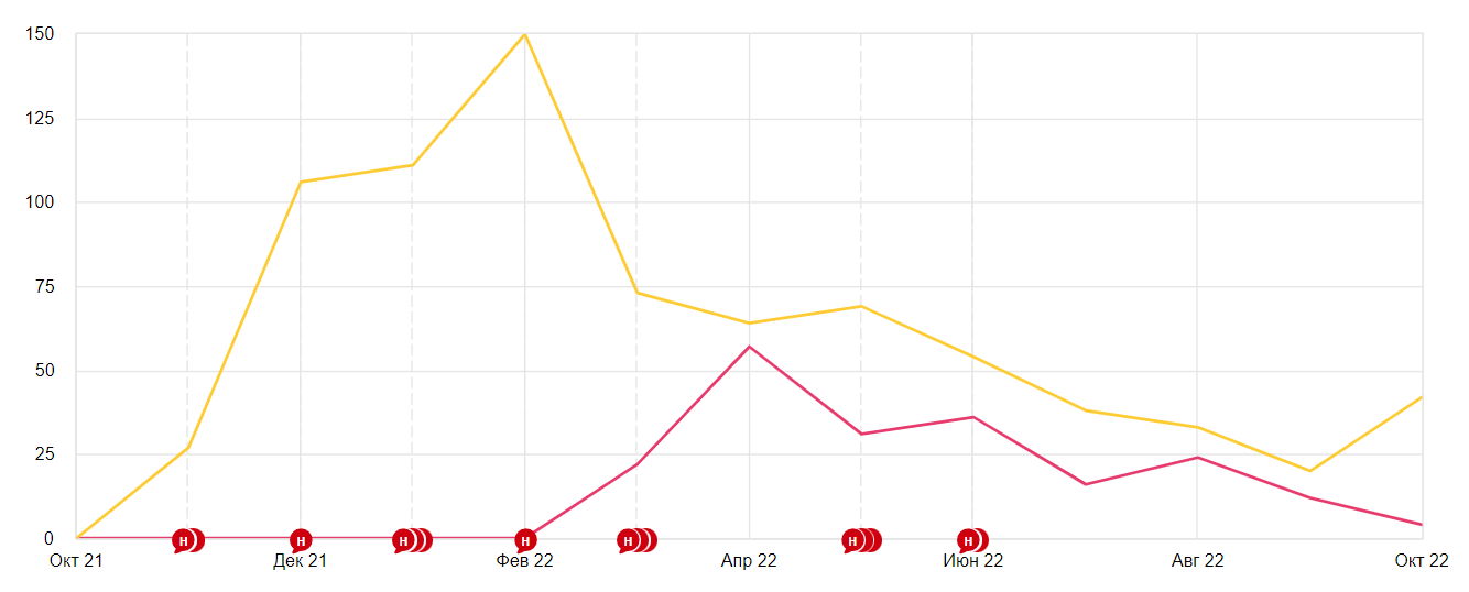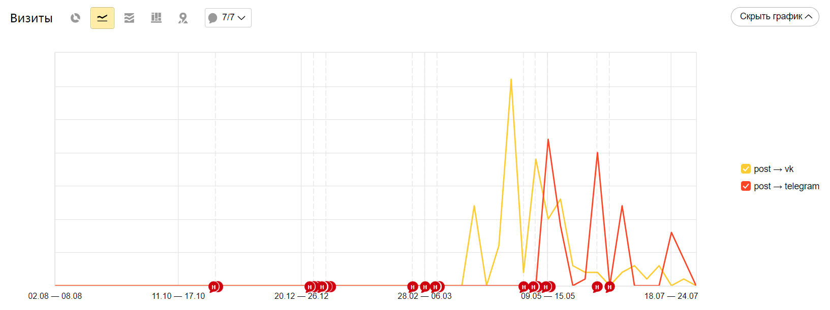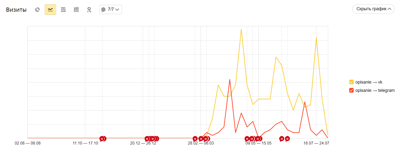 Жёлтый — переходы из Инстаграма на сайт с оформлением карты лояльности, красный — аналогично, но для Вконтакте