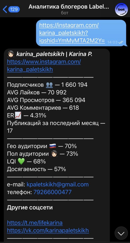 Аккаунты блогеров мы всегда проверяем на качество через специальные сервисы аналитики, например, LabelUp и trendHero. Первый — чат-бот в Telegram, который присылает: