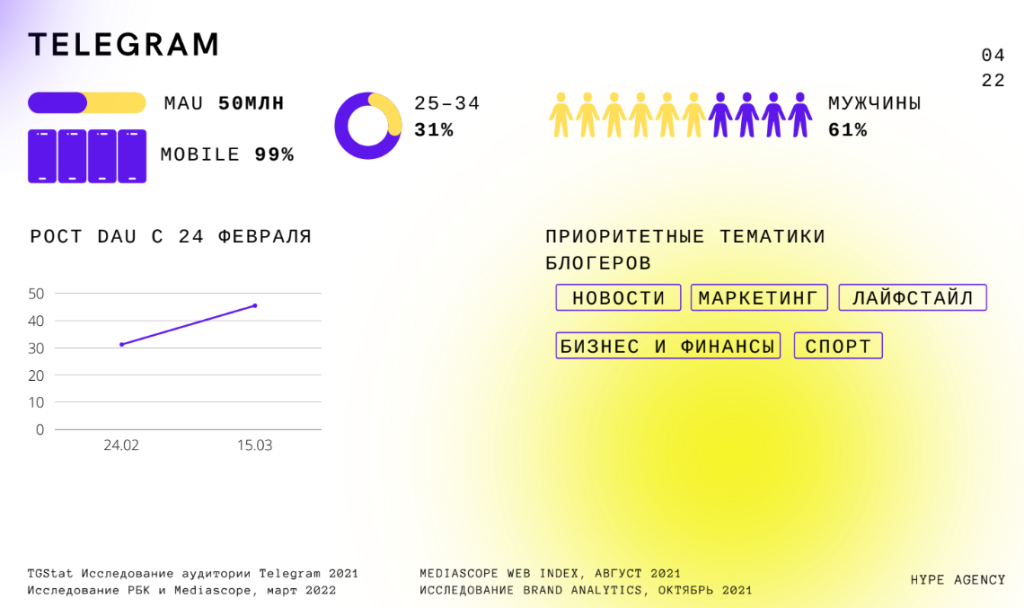 Данные из исследования Mediascope, Brand Analytics, TGStat и РБК от Hype Agency