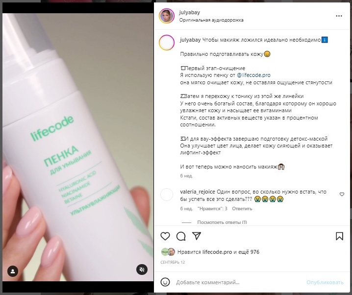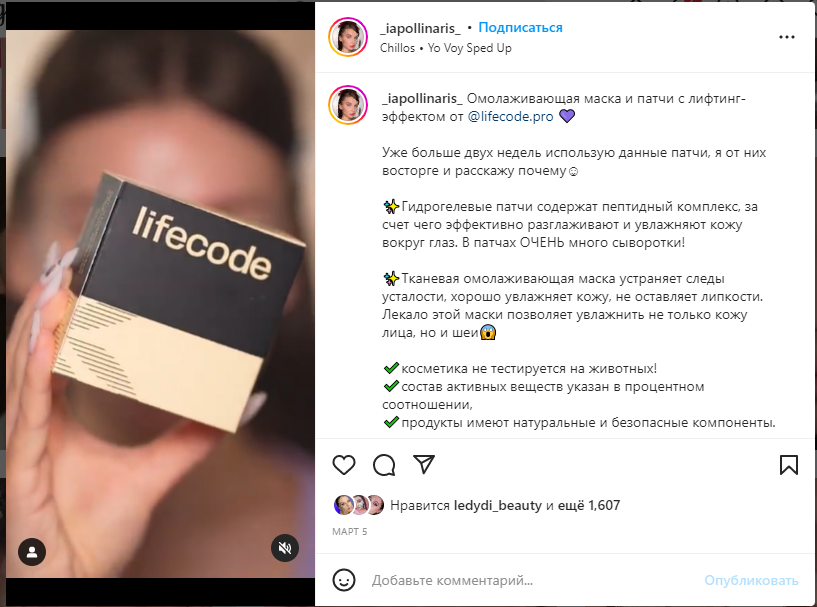 Основной посыл размещений: «Lifecode — это экспертный профессиональный лифтинг-уход, которому можно доверять». Поэтому в рекламе инфлюенсерам нужно было подробно рассказать про продукцию, описать состав, текстуру, запах, продемонстрировать нанесение и сделать акцент на качестве и экологичности уходовых средств. Они также делились собственными впечатлениями от бренда, что сделало подачу рекламы более эмоциональной и вовлекающей.