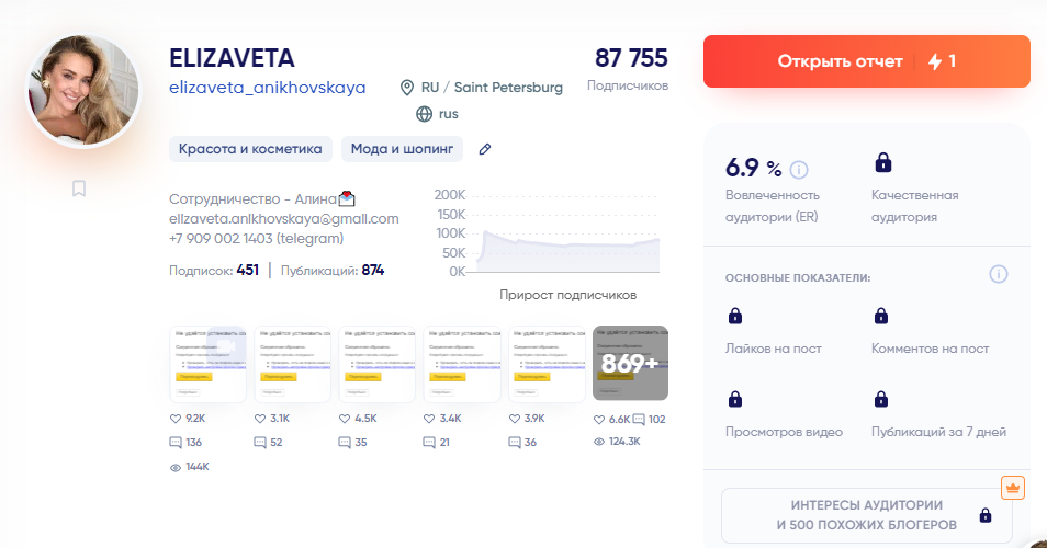 - статистику при отправке запроса: количество подписчиков, среднее количество лайков, просмотров, комментариев, ER, гео, пол аудитории, процент досягаемости и качества аудитории;