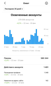 В целом, развитие аккаунта @iwy.help проходило гармонично. Среди конкурентов у нас был достаточно высокий показатель ER = 5%. Ниже приводим краткую статистику профиля, где приблизительно 5 человек в день кликают на ссылку в шапке профиля, 50 человек в день посещают аккаунт, а охват за один месяц составил 279 006 аккаунтов.
