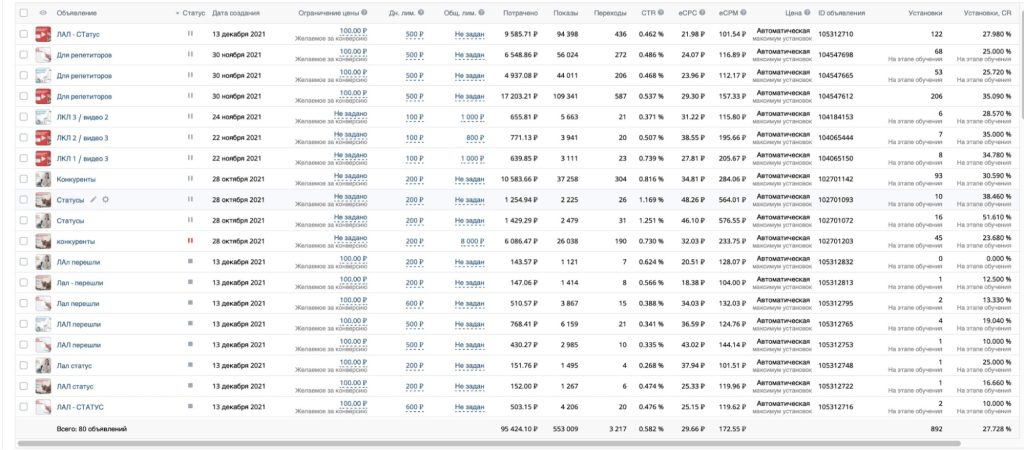 После первых результатов мы поняли какие аудитории и креативы эффективнее. Отключили объявления, не приносящие результаты, и стали искать новые аудитории.
