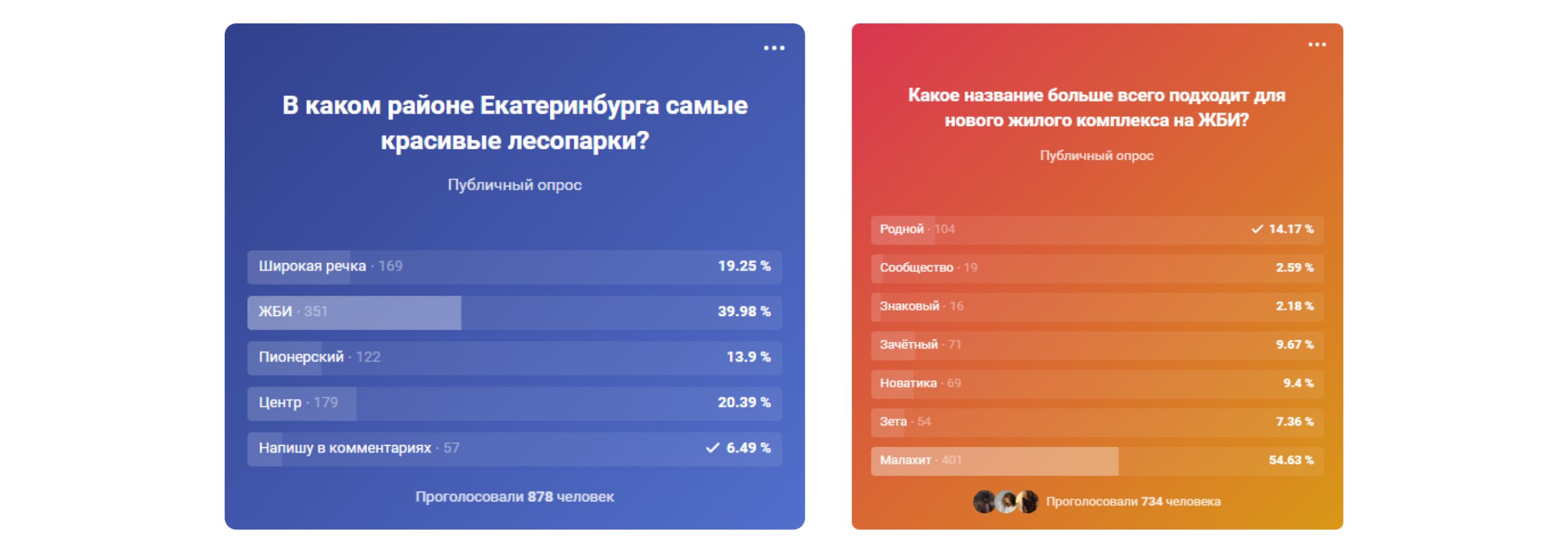 Наибольшее количество реакций собирали посты с опросами и викторинами. Пользователи выбирали из нескольких вариантов. Использовали вопросы, которые касались темы проживания в жилом комплексе или района застройки. Например, опрос «В каком районе самые красивые лесопарки?» набрал 877 ответов в опросе и 90 тыс. просмотров.