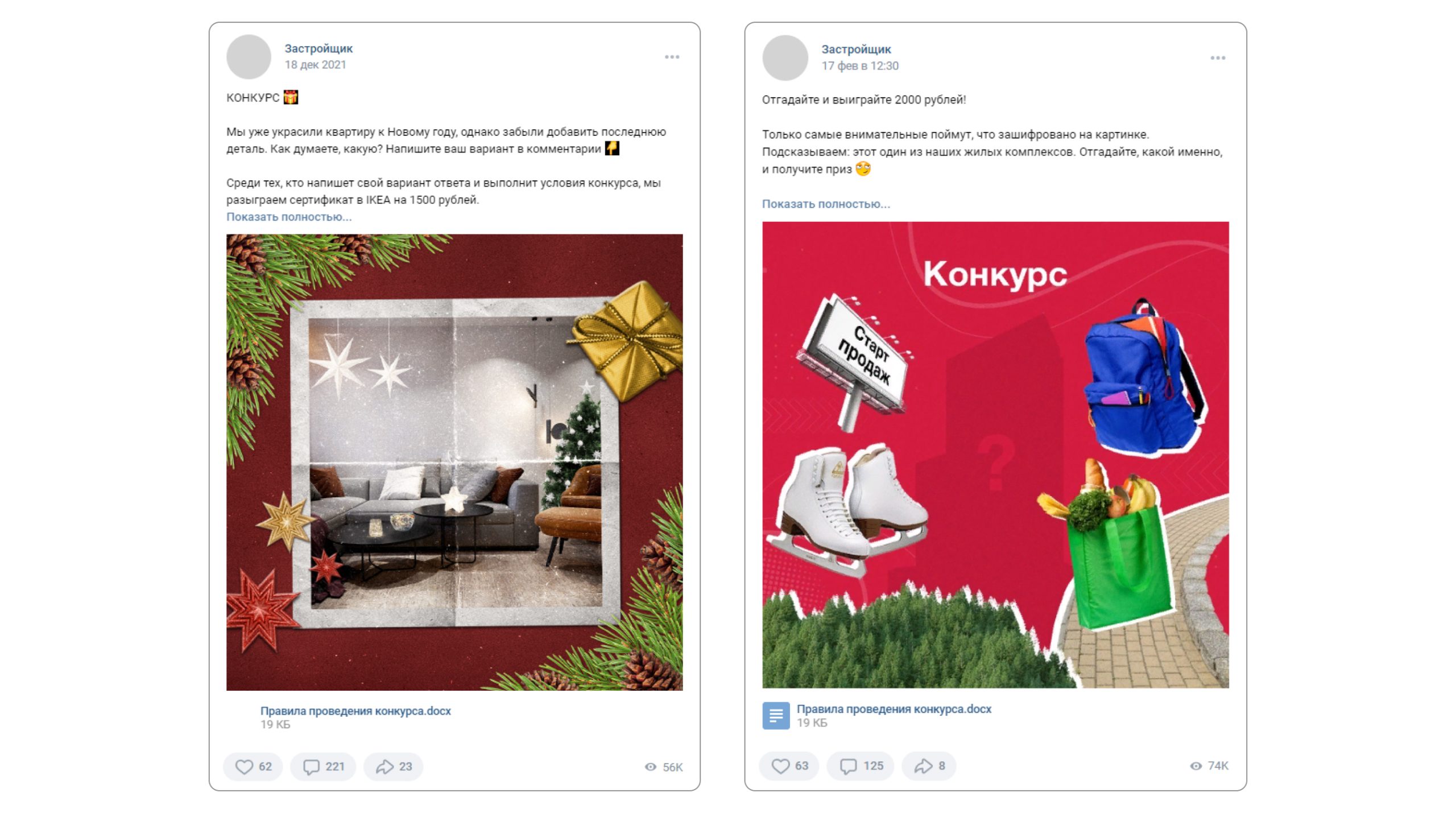 Участники должны были не только репостнуть и лайкнуть пост, но и проявить творческие способности. Например, придумать название новому ЖК, угадать его по определенным фрагментам или придумать недостающий элемент интерьера. Задачей конкурса являлось не просто завлечь участников, но и донести новую информацию о продукте.