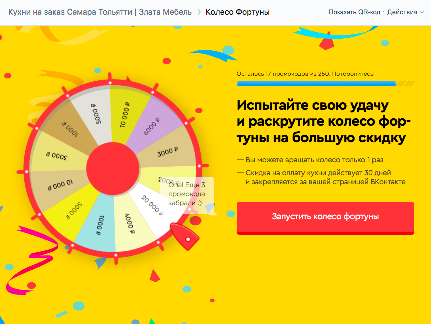 - Колесо фортуны. Это мини приложение на платформе ВКонтакте. У пользователей есть шанс выиграть скидку на кухню.