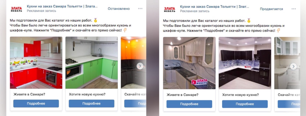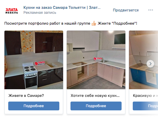 В объявлениях использовали в основном промо посты и карусели. По нашему опыту эти форматы заходят лучше всего. Наиболее эффективными оказались карусели с фотографиями кухонь и яркие баннеры с УТП и офферами.