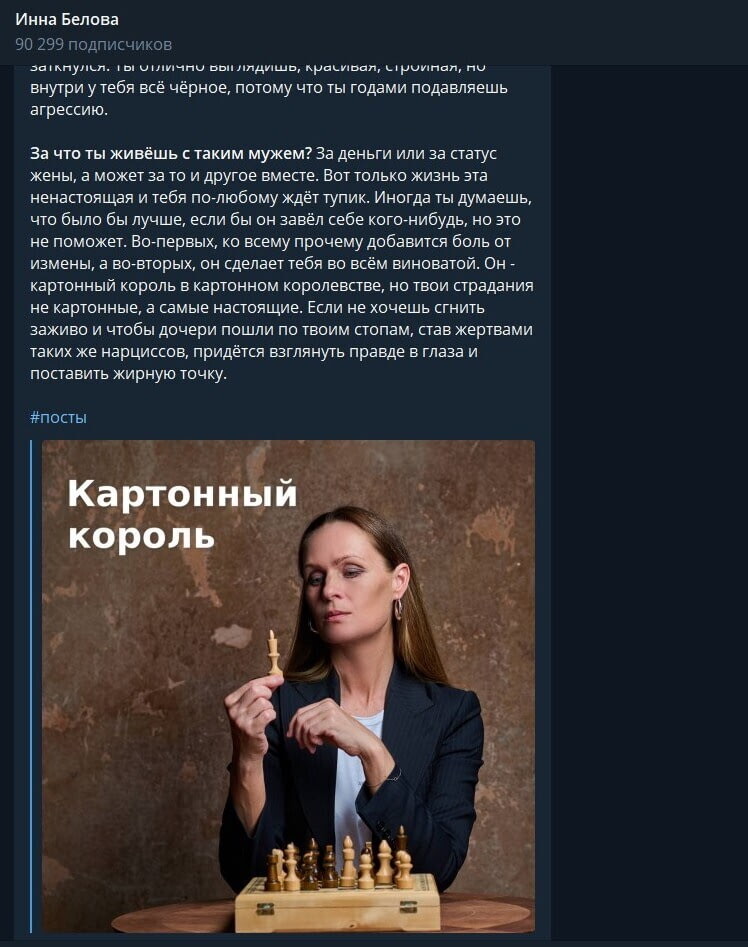 https://t. me/belovainnapsy — канал от Инны Беловой, психолога с 19-летним стажем, который на своем канале делится профессиональными советами и разборами для женщин на острую тему – «Измены». Через глубокое понимание болей аудитории и твердую экспертность, автор создает очень качественный и востребованный контент, который вирально разлетается по другим каналам в Telegram. Инна продает свои курсы, в которых помогает женщинам в сложных ситуациях в отношениях, и уже помогла тысячам женщин по всему миру.