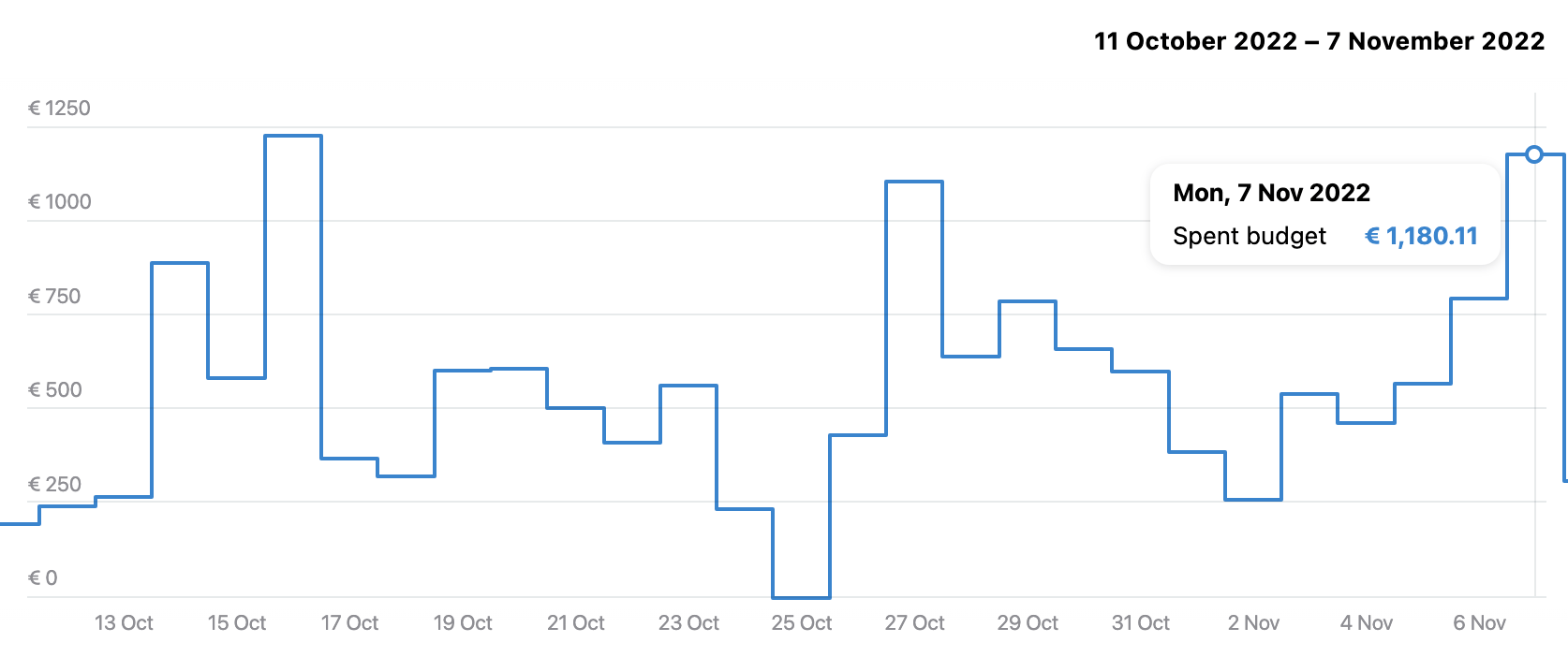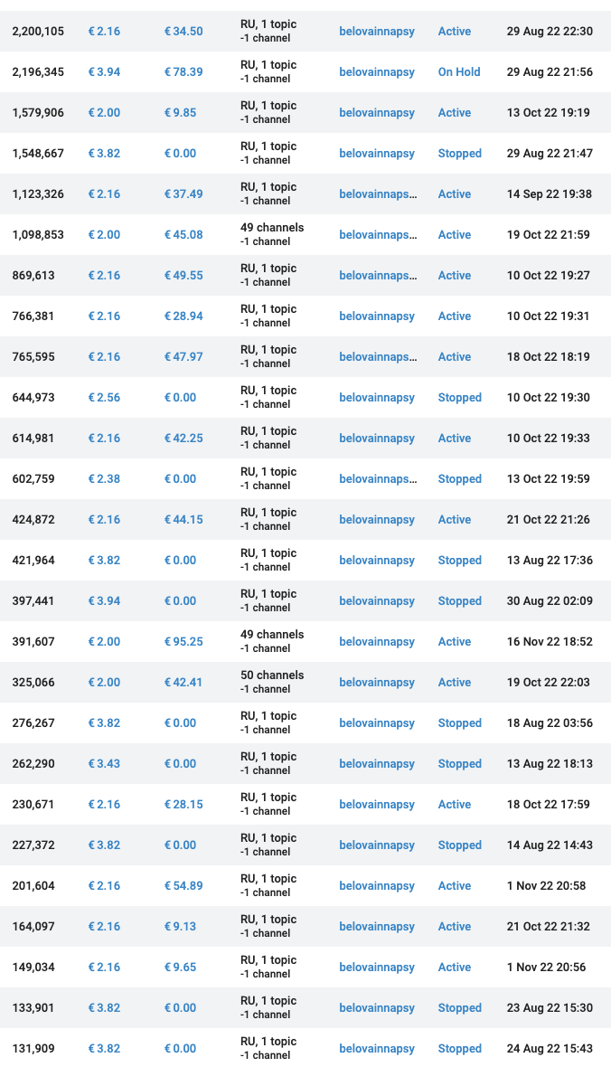 В некоторые периоды мы сознательно разгоняли бюджет аж до 2303 подписчиков в сутки всего за 1180 евро. Это около 0,5 евро или 31,5 рубль за подписчика. Нужно добавить, что это не рекорд. Максимум в сутки мы осваивали на другом проекте более 2500 евро в сутки.