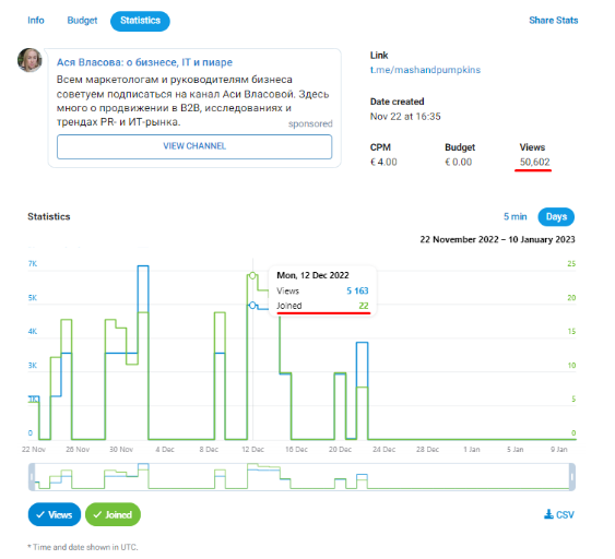 Самый, на наш взгляд, большой недостаток Telegram Ads — это отсутствие хорошей аналитики. Во-первых, из сведений, которые можно получить по результатам открутки рекламных объявлений, есть только расход бюджета, показы и подписчики. Пожалуй, самым болезненным является отсутствие данных о кликах и, как следствие, отсутствие CTR, зная который маркетолог может понять, насколько объявление релевантно аудитории и на каком этапе страдает эффективность. Во-вторых, данные предоставляются только либо за текущий день (каждые 5 мин), либо посуточно за предыдущие дни. Возможности выбрать конкретный временной промежуток или месяц нет. В-третьих, статистика предоставляется только по каждому объявлению в отдельности. В-четвертых, нет возможности понять, какие именно каналы из подборки или топика приносят нужный результат.