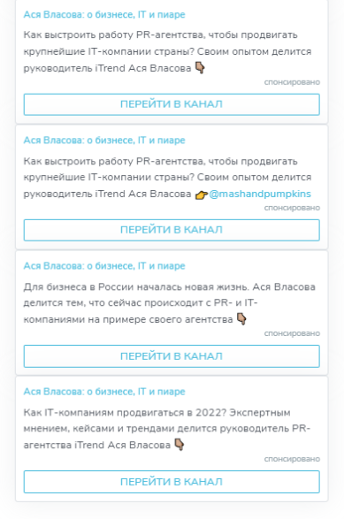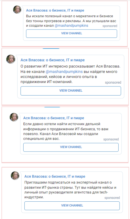 С одной стороны, такое разнообразие типажей — а значит, и интересов — расширяет возможности поиска ЦА. С другой — снижает конверсию, потому что человек, погруженный в тему развития IT-бизнеса, может не кликнуть на объявление, увидев в тексте, что канал еще и про PR и маркетинг.