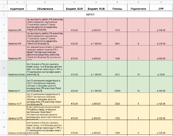 - Остальные 30% бюджета мы запланировали на продвижение не самых дешевых связок по результатам предыдущих тестов (а именно — таргетинг на подборку каналов и продвижение объявлений на тему PR). Но при этом выдвинули гипотезу, что написание новых текстов поможет добиться снижения CPF.
