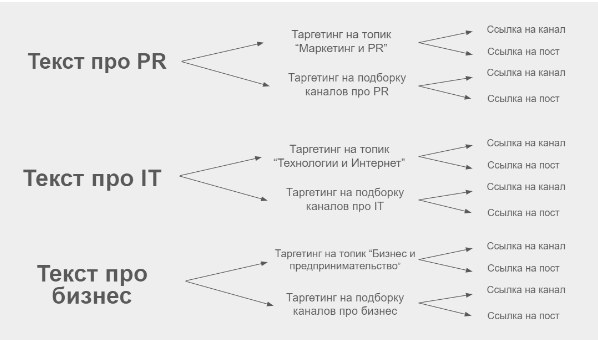 Чтобы решить эту проблему, мы разделили аудиторию по принципу одного из трех ключевых интересов, соответствующих главным темам канала: IT, PR, бизнес. Для каждой категории мы подготовили релевантные тексты, а также использовали разные настройки таргетинга.