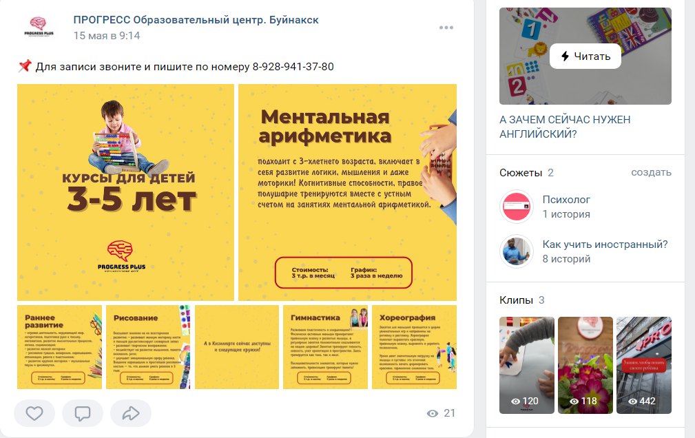Сейчас: без рекламного бюджета просмотры увеличены в 3 раза (400-800), охват 12000, бренд раскачан — открывается 4-ый центр по франшизе.