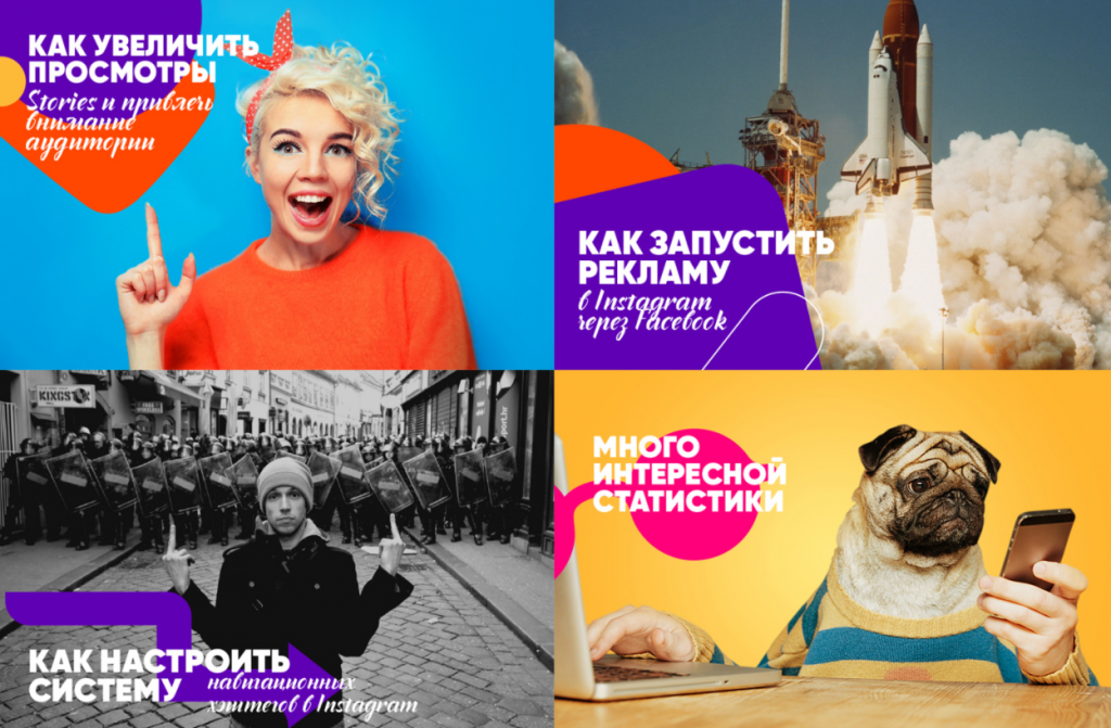 Сформировав систему из пиктограмм, плашек и яркой цветовой схемы, ушли с головой в … И тут было все. Основой для вдохновения пиктограмм стали стикеры из сети, пятнами были выбраны плашки отсылающими нас к популярным цифровому пространству, цветовую палитру мы закладывали изначально, то есть она была еще до нас, на старом логотипе Леши — это фирменный градиент Instagram. Нам нужна была система цветов и мы разложили градиент на палитру.