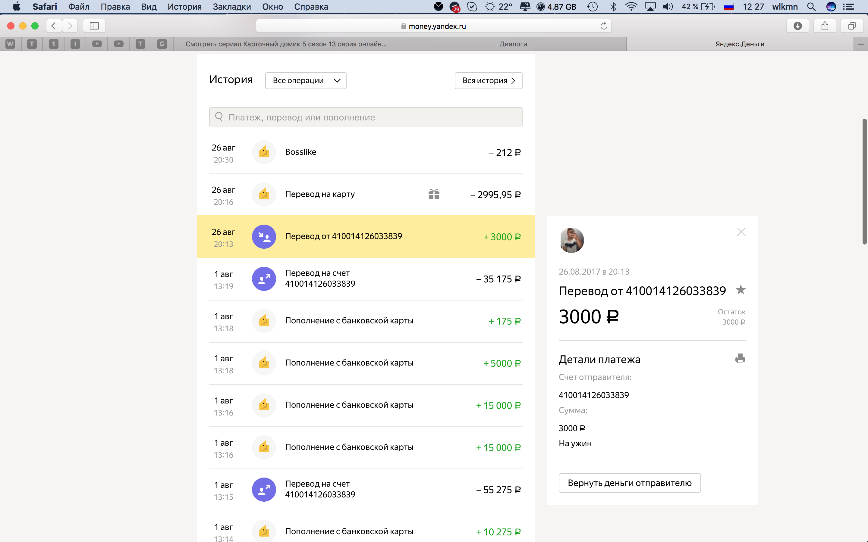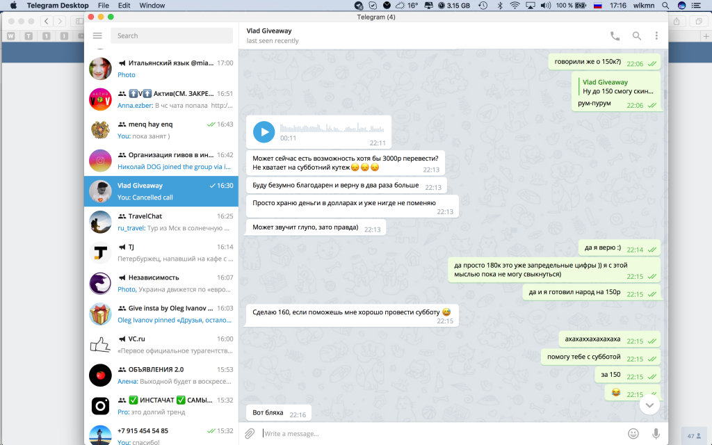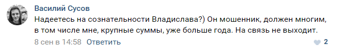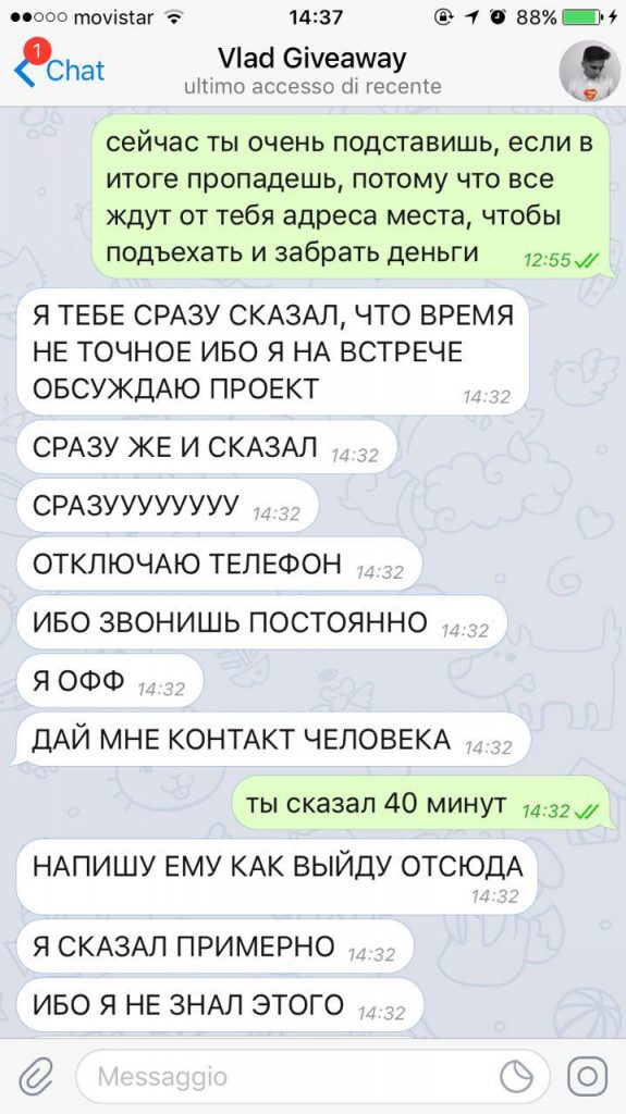 Влад пытался спрыгивать на дурачка, теряясь в показаниях и регулярно менял свои версии развития событий. То деньги уже отправлены и идут, то он не знает номер кошелька, то сейчас денег нет и надо подождать. В один из моментов я даже согласился выступить «гарантом» и принять наличные деньги, чтобы в последствии отправить их обманутому Никите, но до меня так никто и не доехал.