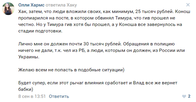 Тогда Влад Конош выступал жертвой, которому накрутили ботов и не вернули деньги. Он громко возмущался и планировал подавать заявление в суд. Именно это и послужило базой для моего запаса доверия к товарищу, а зря.