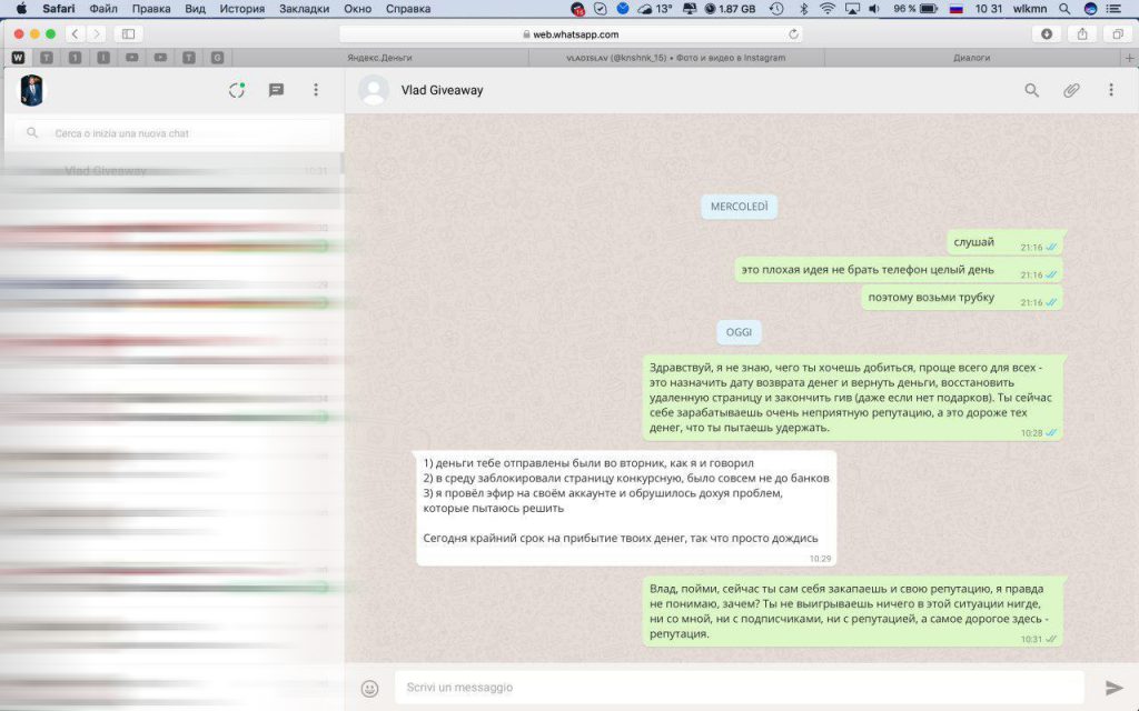 Я, как и любой нормальный пользователь, запрашиваю деньги обратно, т.к. не состоялся гив — верни деньги, он растягивает это на три дня, объясняя сложностями с пополнением Яндекс.Денег в Беларуси и после этого он удаляет страницы гива и личную в инстаграме, не подходит к телефону, и всячески уворачивается от звонков.