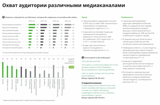 По данным Всероссийского омнибуса GfK, к началу 2019 года аудитория Интернет-пользователей в России среди населения 16+ составила 90 миллионов человек (+3 миллиона человек к прошлому году) и достигла отметки 75,4% взрослого населения страны.