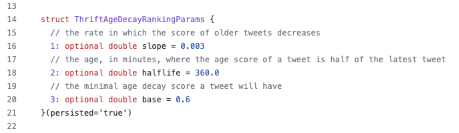 Алгоритм снижает актуальность твита на 50% каждые 6 часов.